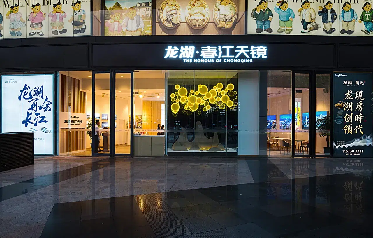 以 “春江天镜” 案名为灵感锚点,我们为其展示厅打造山水交融的空间叙事。提取山、水主元素符号,借创意橱窗构建视觉焦点 —— 山峦轮廓化作墙面造型,层叠错落;流水形态以线性灯光、镜面材质演绎,灵动呼应。